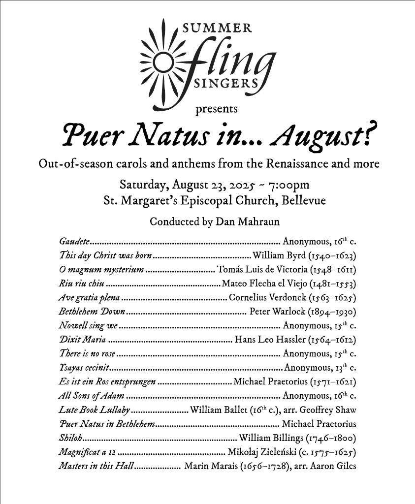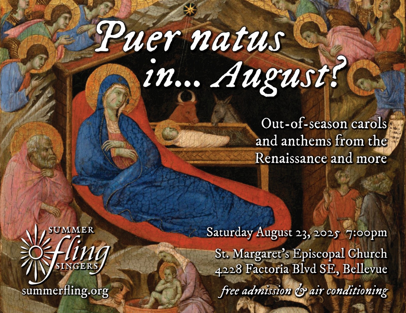 Our ninth concert, Puer Natus in... August? took place on Saturday, August 23, 2025 at St. Margaret's Episcopal Church in Bellevue, WA. Below you will find links to photos, programs, and samples from the concert.